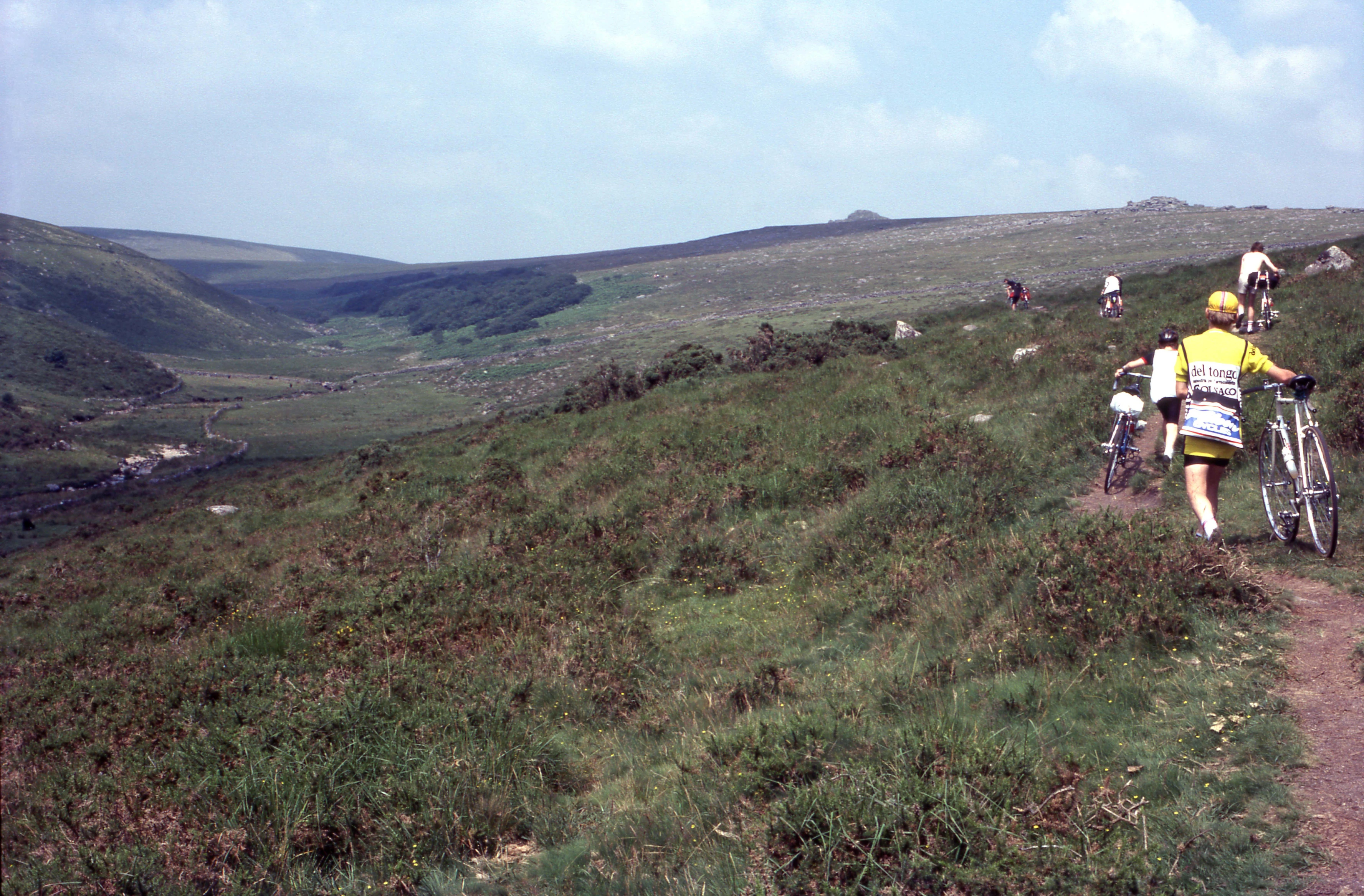 Pushing the bikes along the footpath from Two Bridges towards Wistman's Wood, with Crow Tor beyond