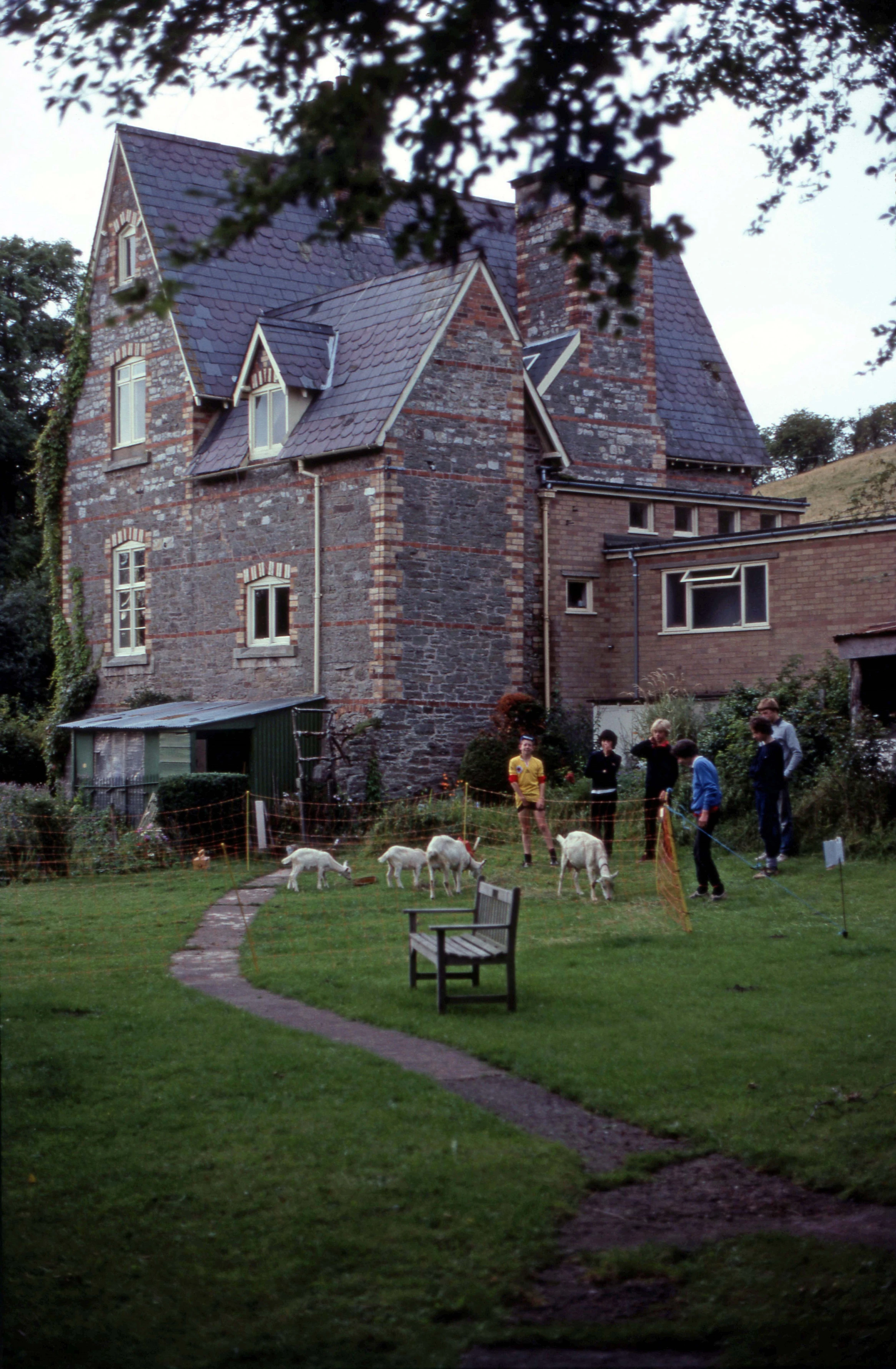 Andrew W, Richard, Matthew, Stephen, Mark and Kevin with the goats at Bridges youth hostel