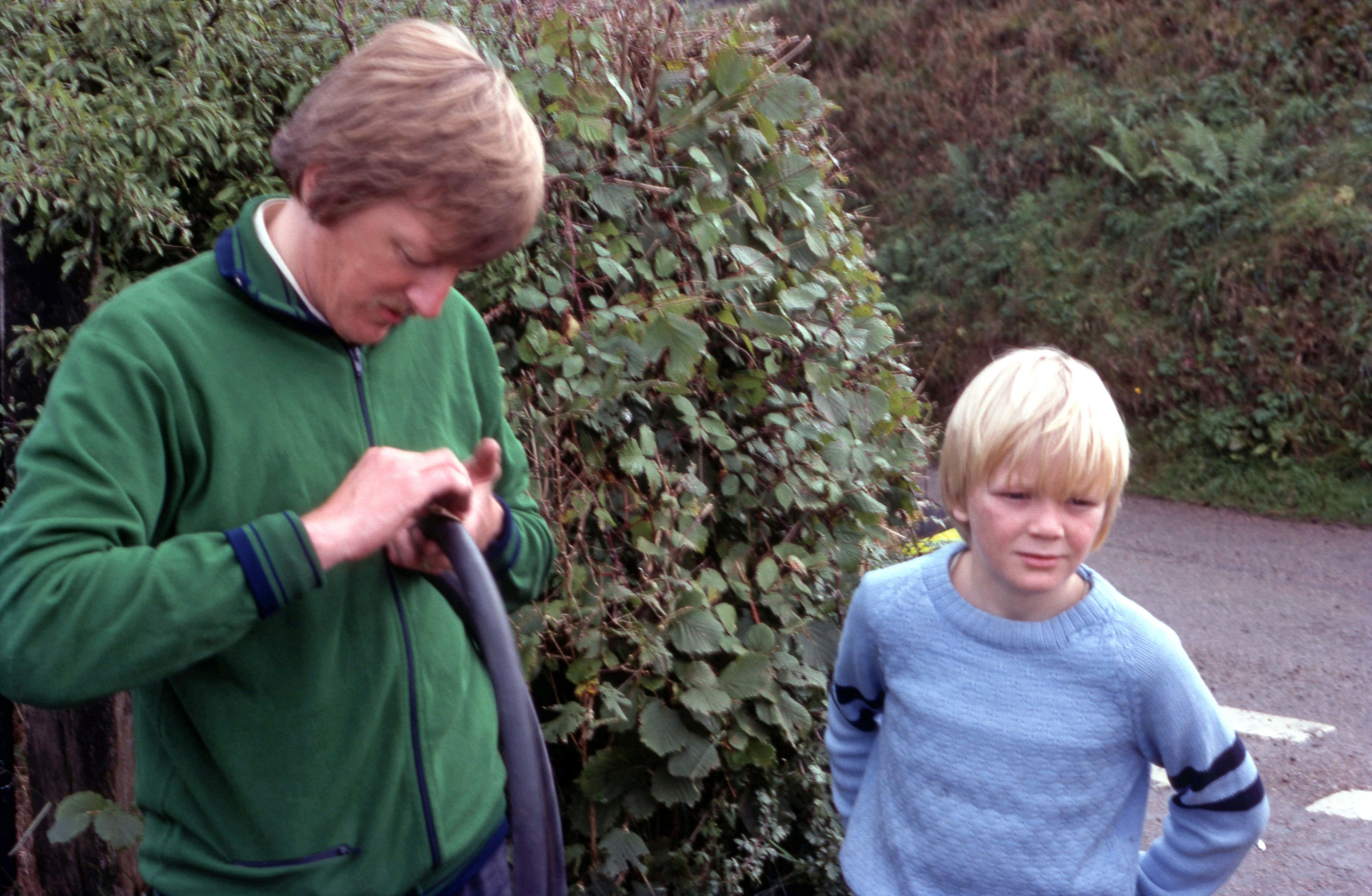 Phil and Matthew Burrows help with the puncture repair
