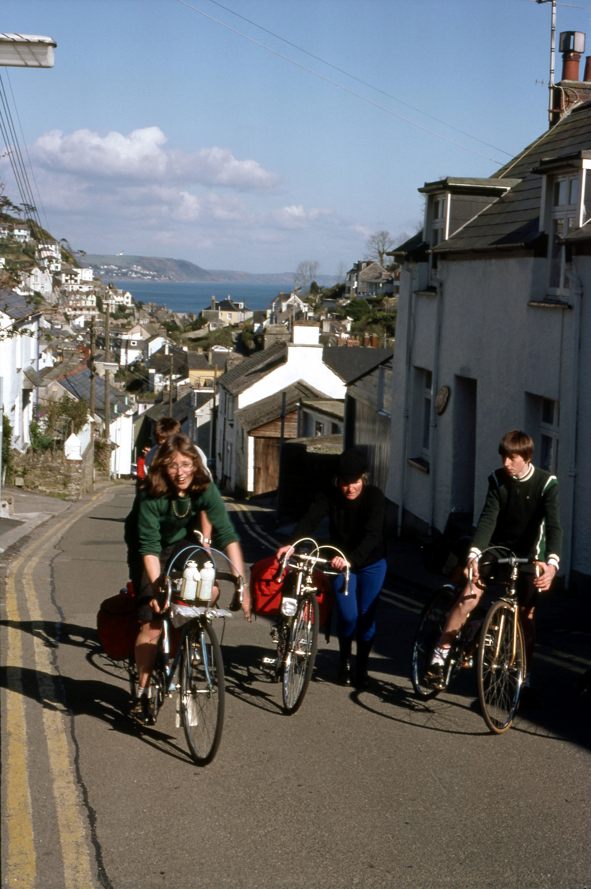 Jackie, Val and Nigel on the very steep climb of West Looe Hill