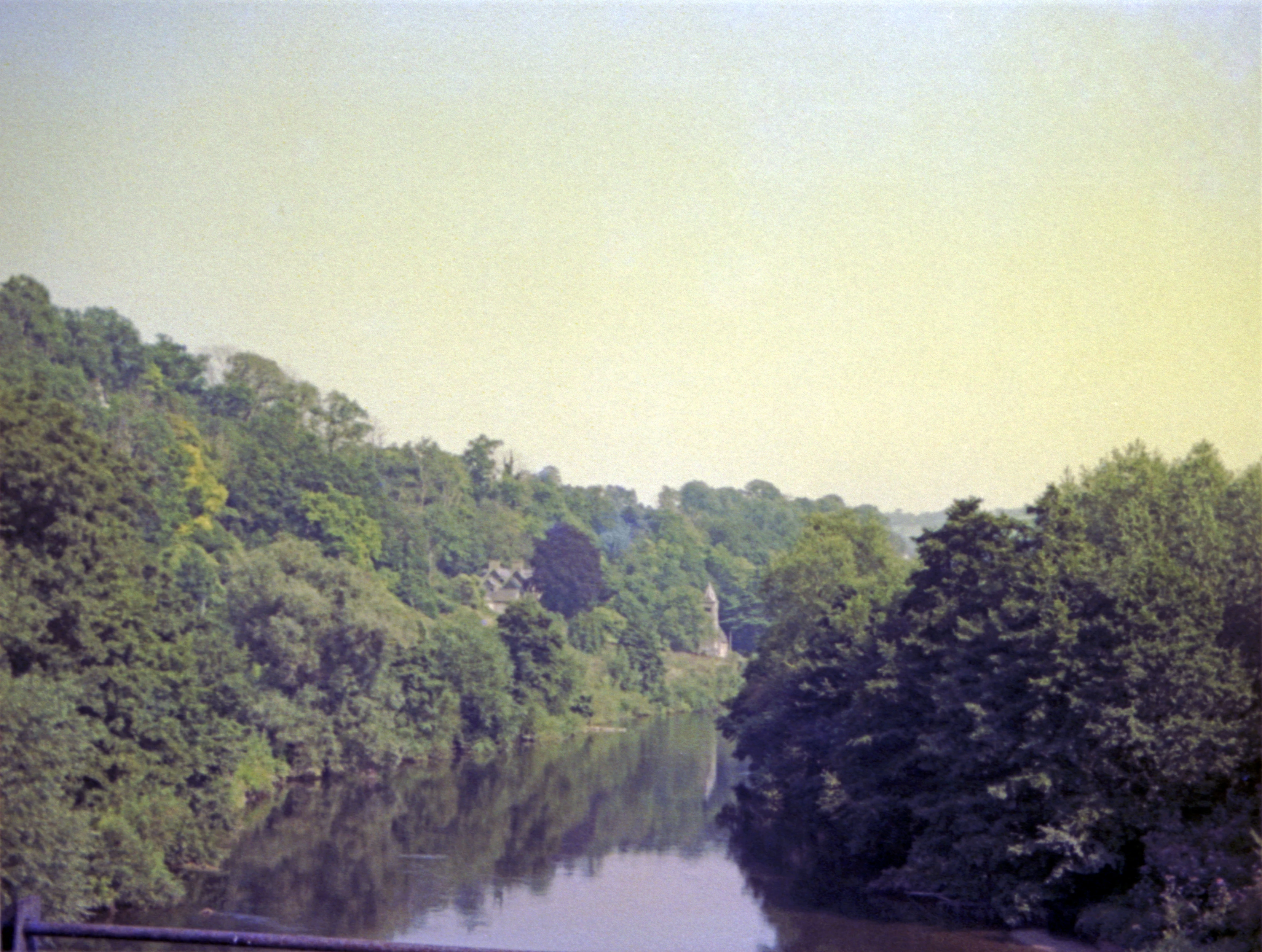 Welsh Bicknor hostel and church in a fabulously secluded location by the River Wye, viewed from the precarious old railway bridge on the way to Stowfield