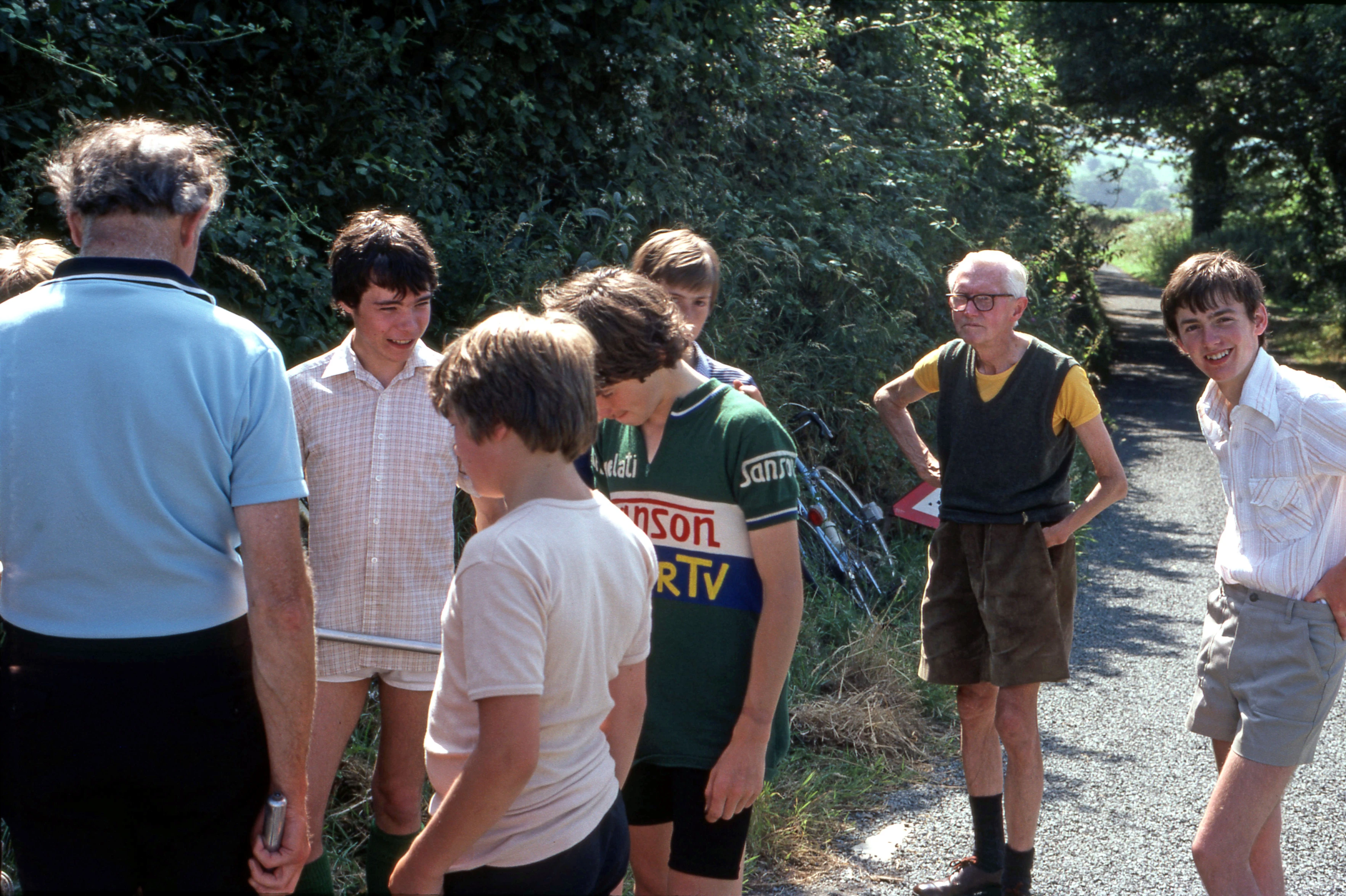 Colin Brierly, Darren Sharp, Simon Haly, Mark Moreton, Nigel Wilson, Frank Boyes and John Stuart, repairing Kevin's punctures in the lanes near Harberton