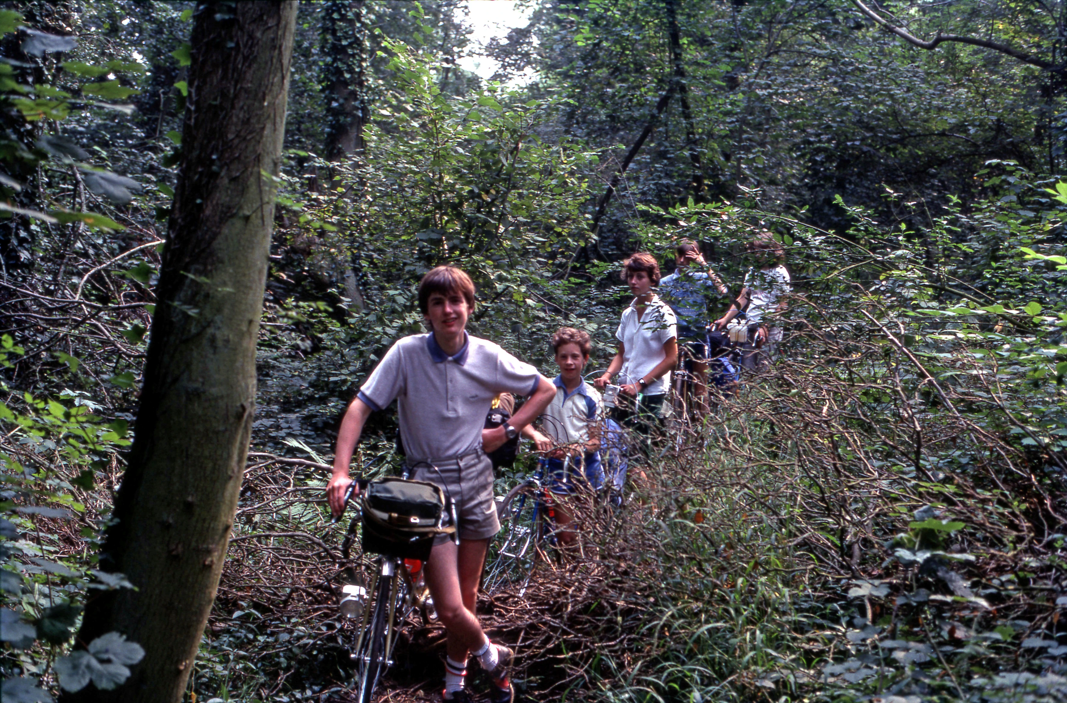 Our extremely long and difficult "short-cut" through the woods. John, Glenn, Frances, Nigel and Jackie