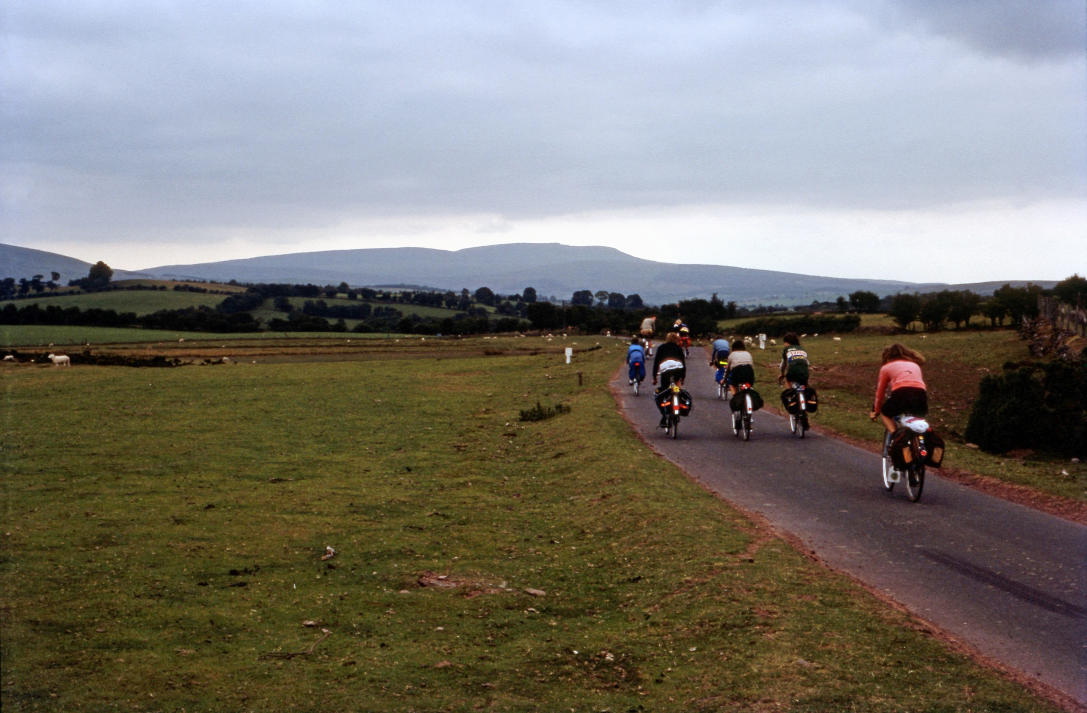 Riding over Mynydd Illtud, near Blaencamlais, with the Brecon Beacons looming in the distance