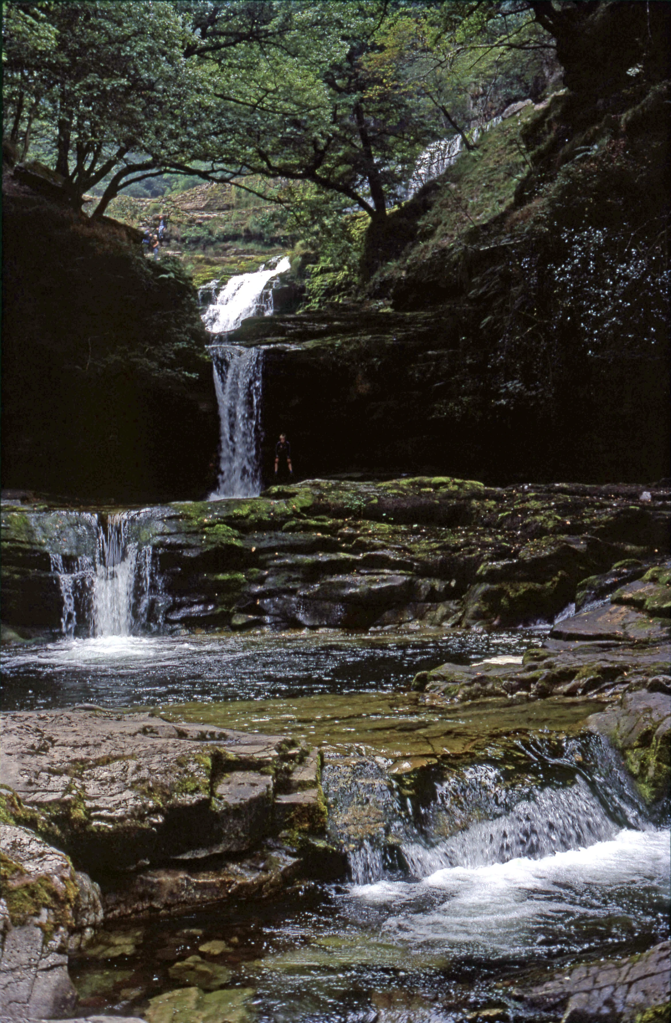 The second waterfall - Sgwd Isaf Clun-gwyn, or Lower Fall of the White Meadow - with Matthew trying to stay dry