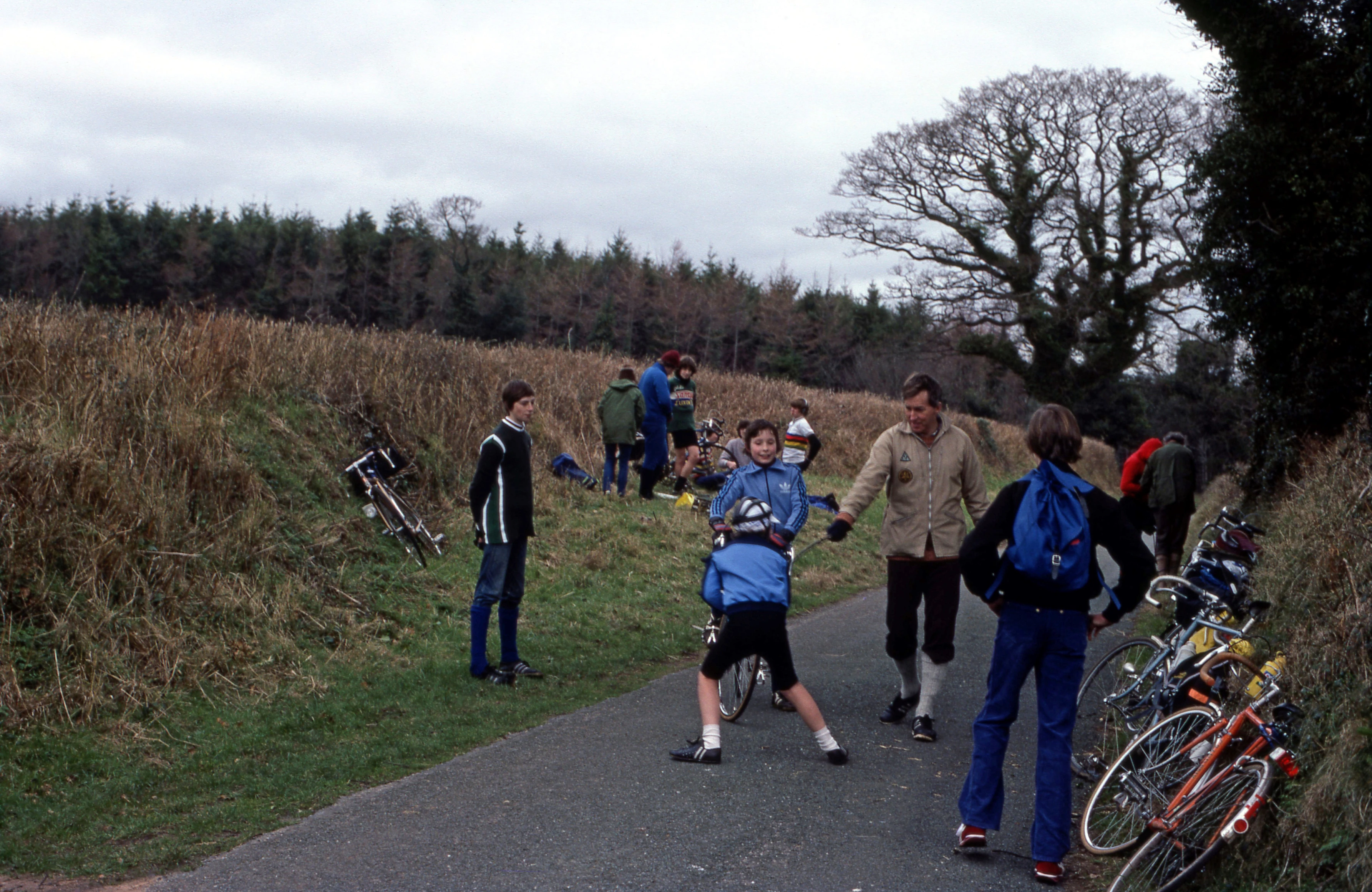 New member Andrew Giles watches the fun and games while Kevin's puncture is repaired near Wilsworthy Farm, Kenn