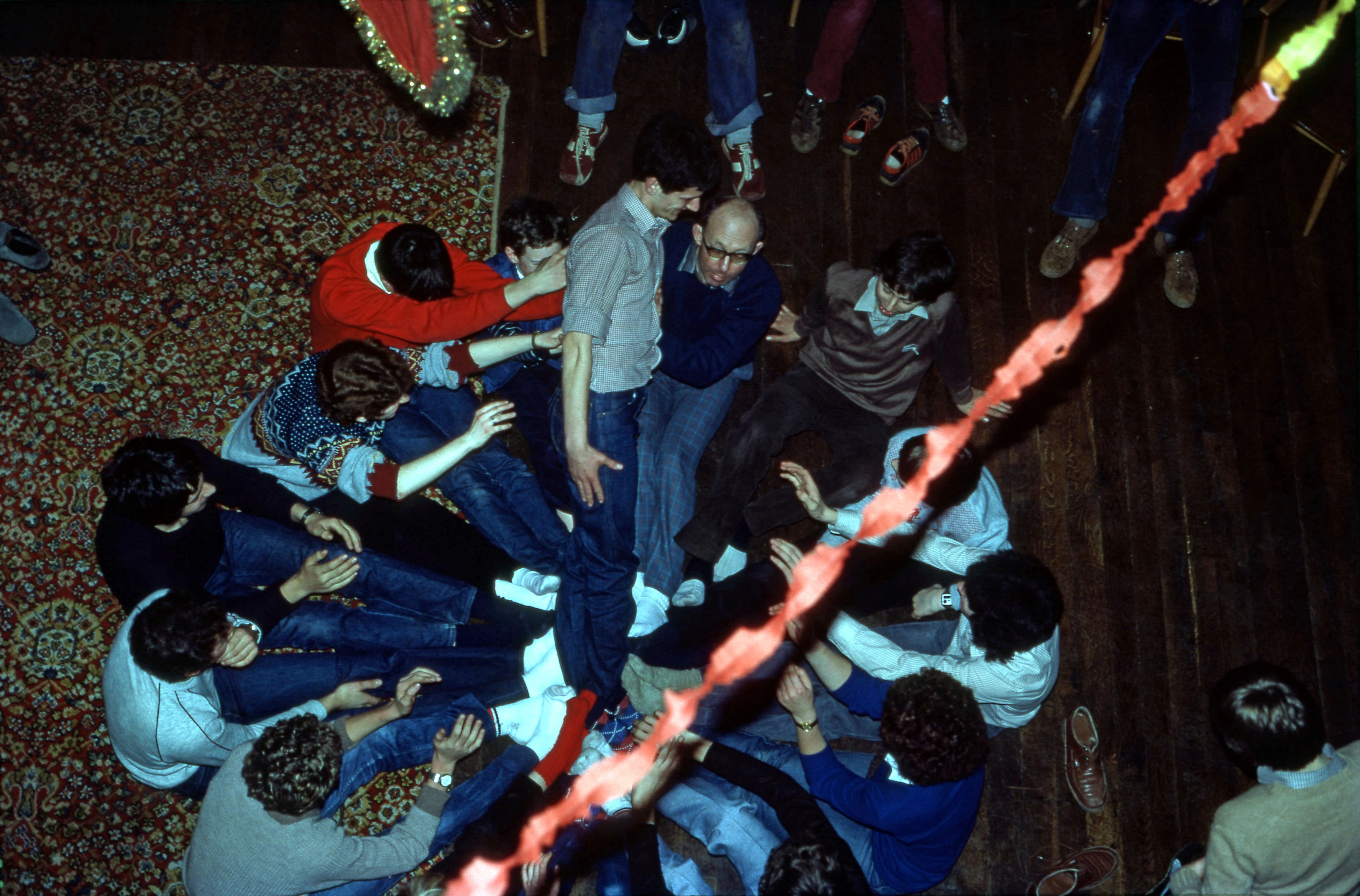 Fun and games in the main hall at Maypool, viewed from the balcony