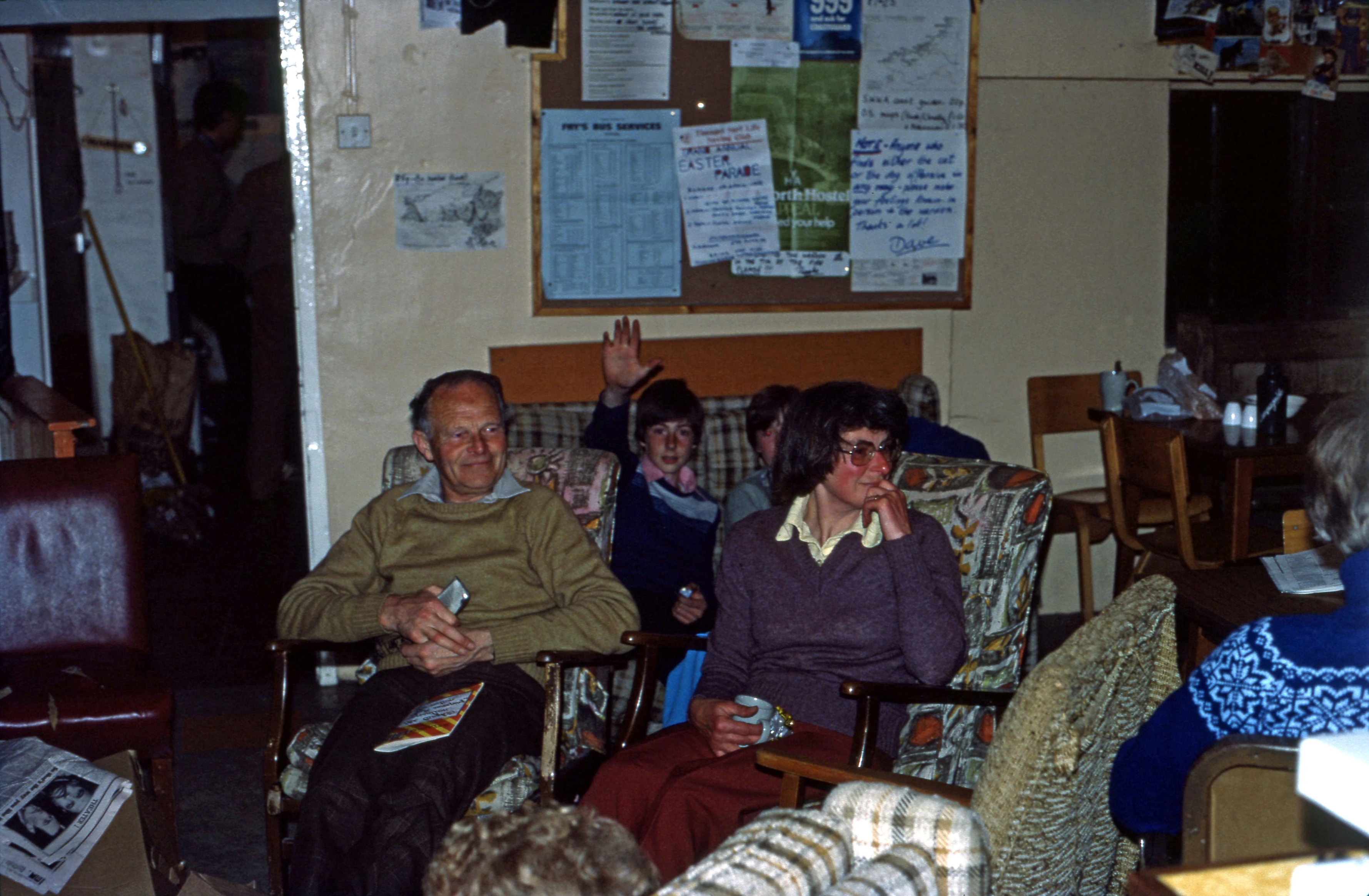 Colin Brierly, Nigel Wilson, Wendy Luxton, Iris Buckler and Jean Brierly in the Tintagel youth hostel common room