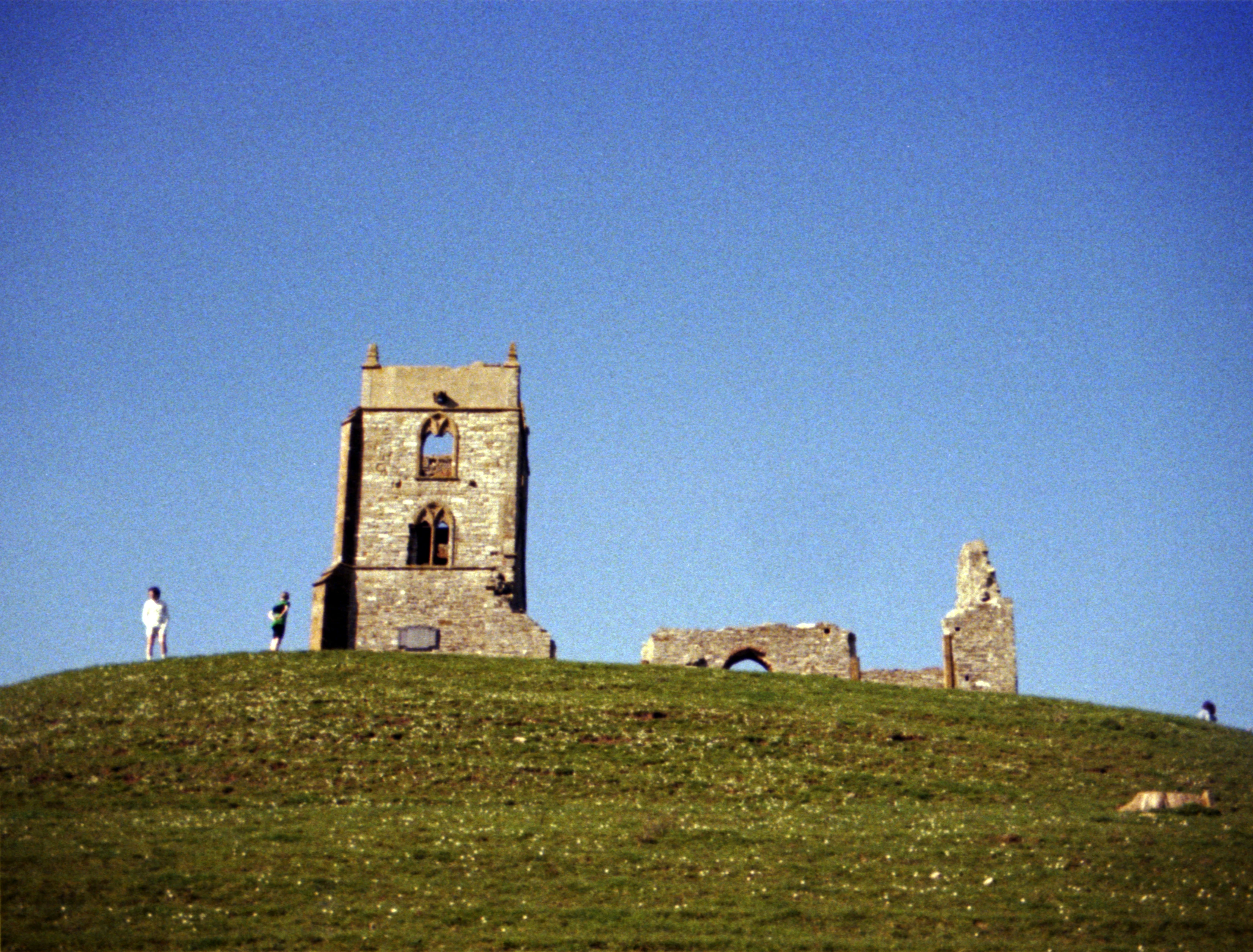 The ruined church on Burrow Mump near Othery. We met a Bridgwater CTC rider (in white).