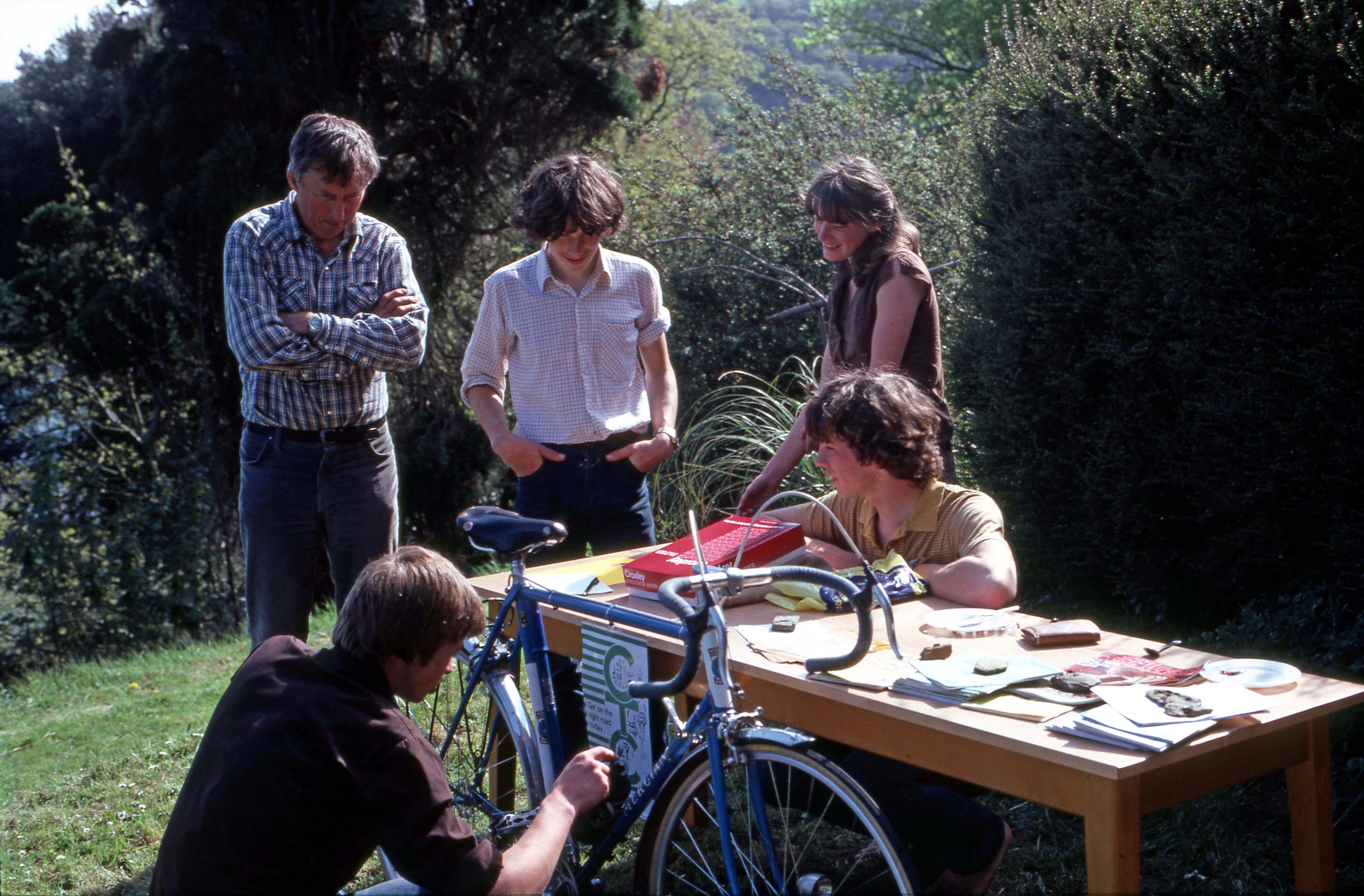 Michael Ward's Highwayman stand at Maypool youth hostel's May Fair, with Kevin adjusting his bike and Don and Mark looking on