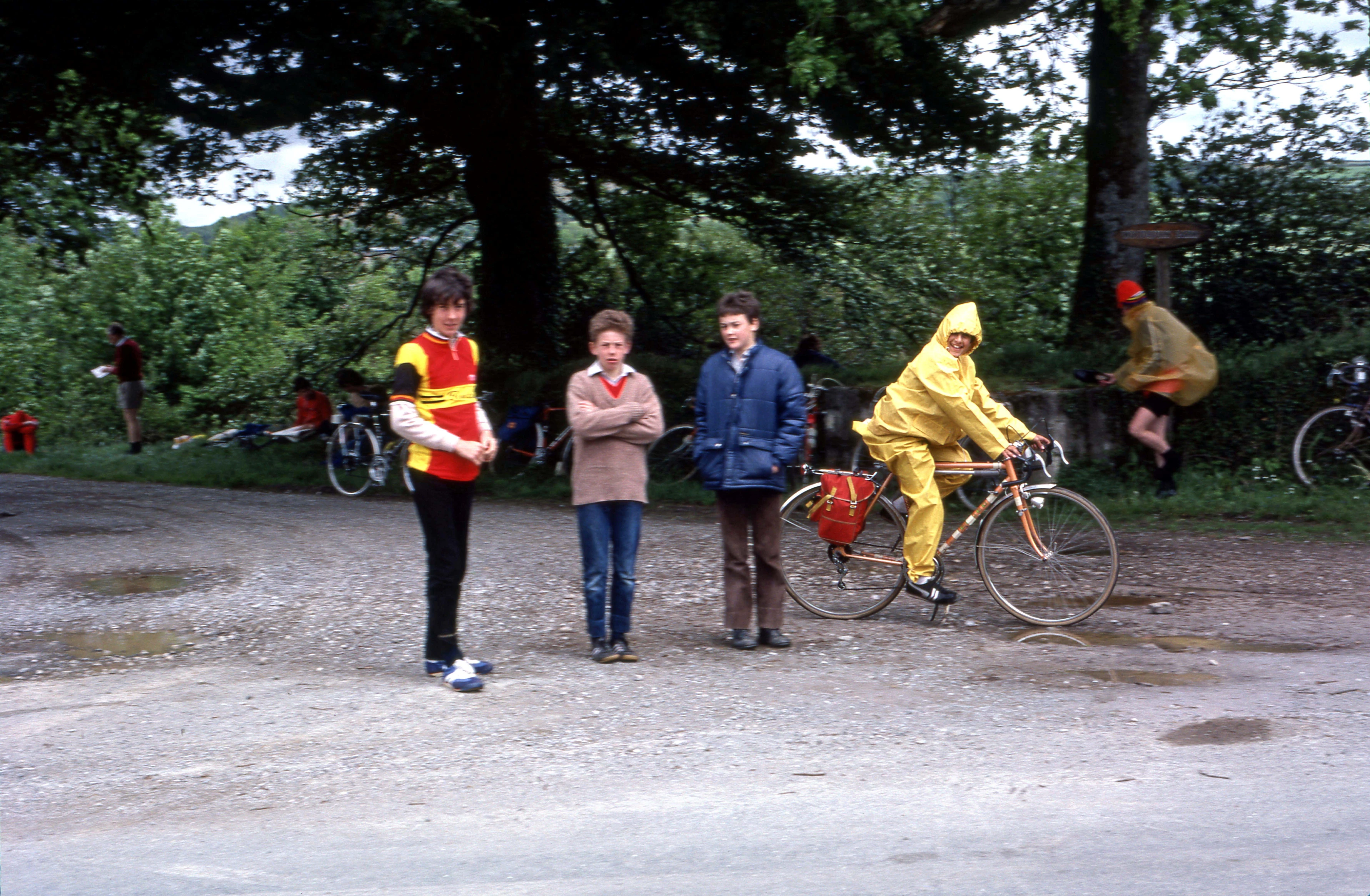Lunch at the entrance to Woodburn Farm near Mark's Bridge, Ivybridge: Stephen Downer, Andrew Winstanley, Neil Pena and Richard Read
