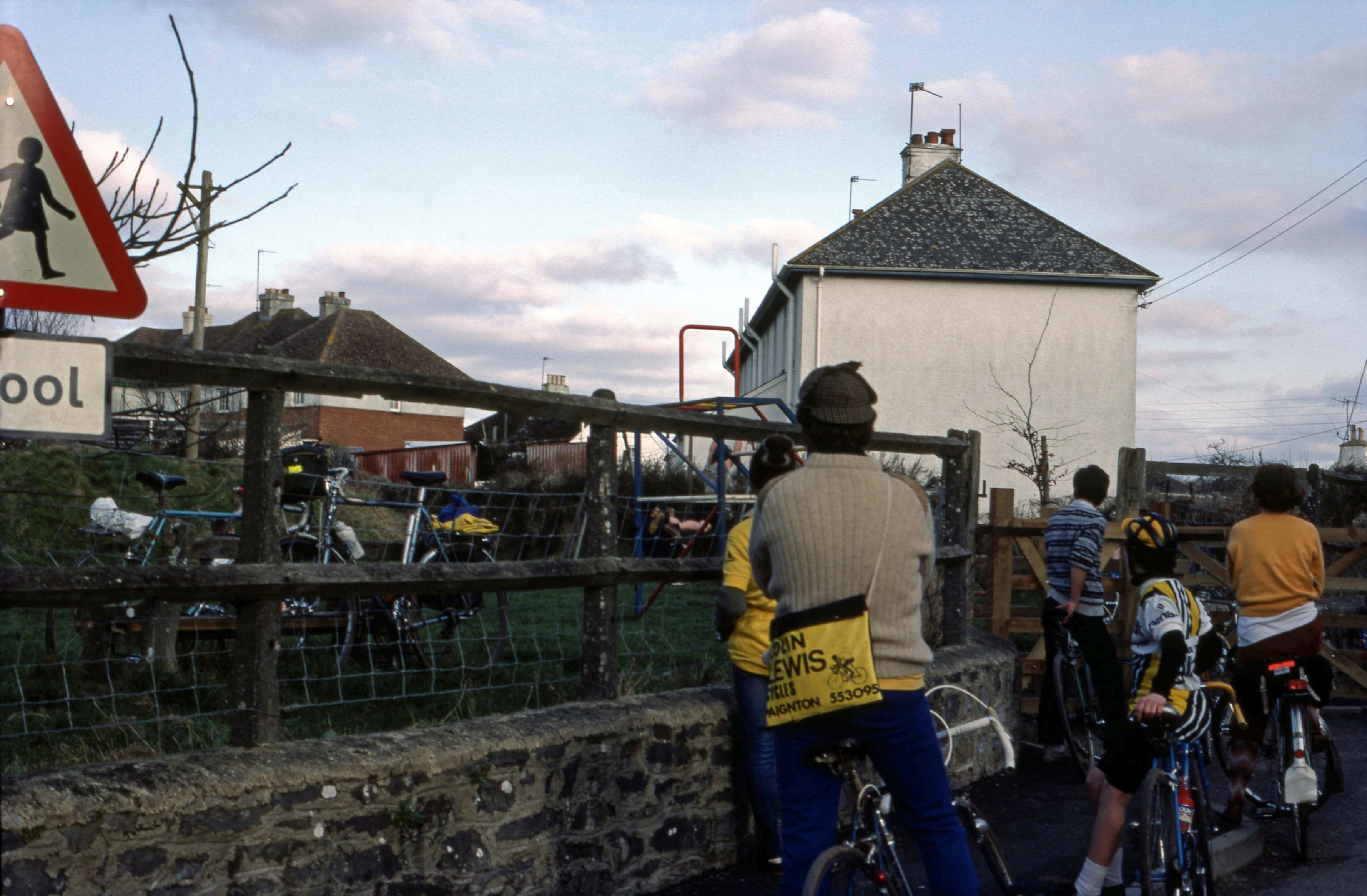 Dave Eyre, Andrew W and Glenn P watch the fun from outside the park at Broadhempston