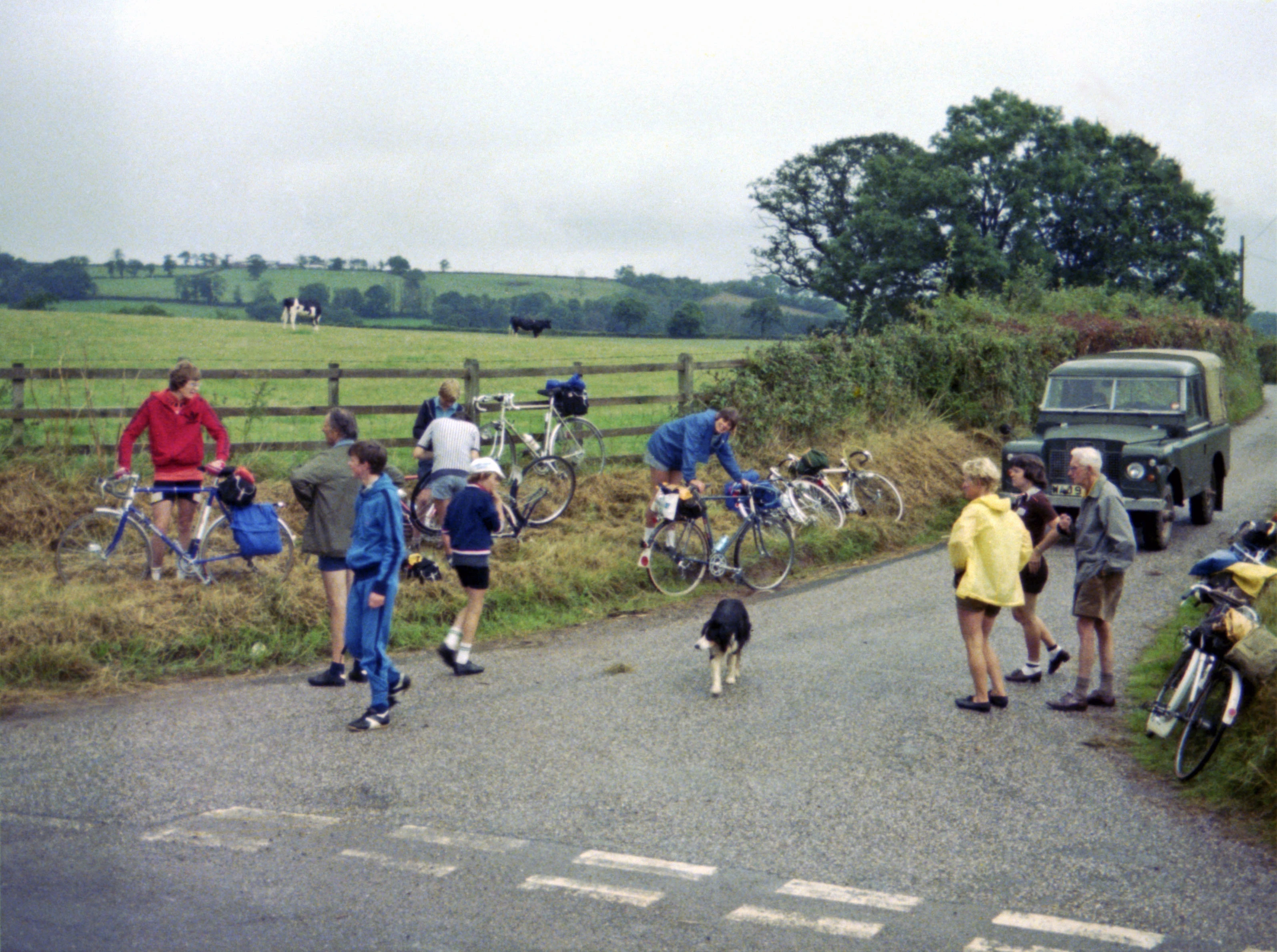 Antony’s puncture at Way Mill, Butterleigh. Everyone present—except Don, behind a bush.