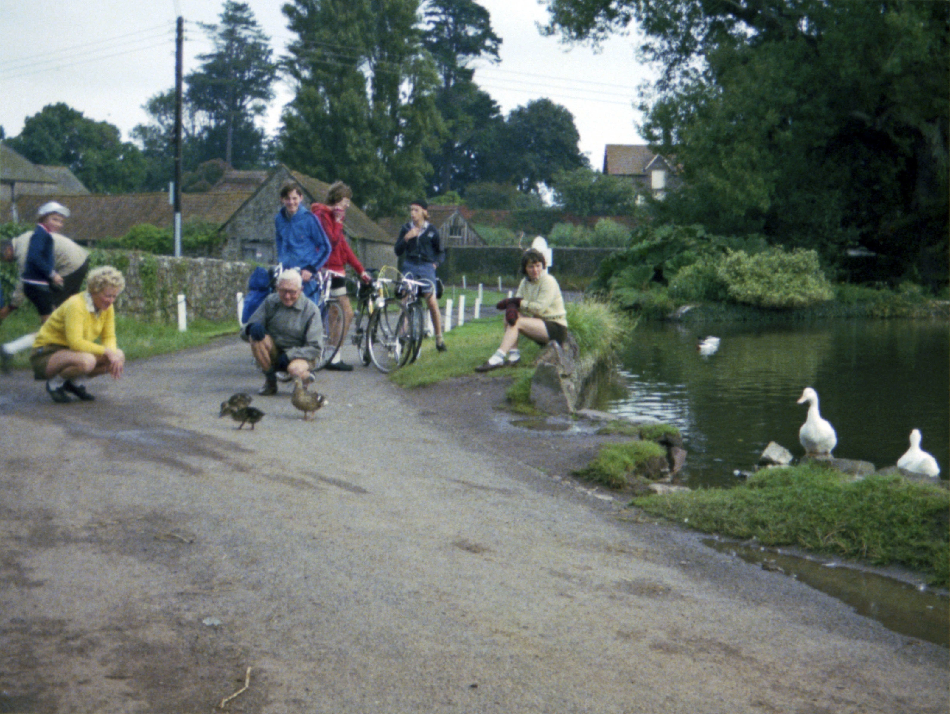 East Quantoxhead. Jean and Frank enjoy the ducks while Liz ponders.