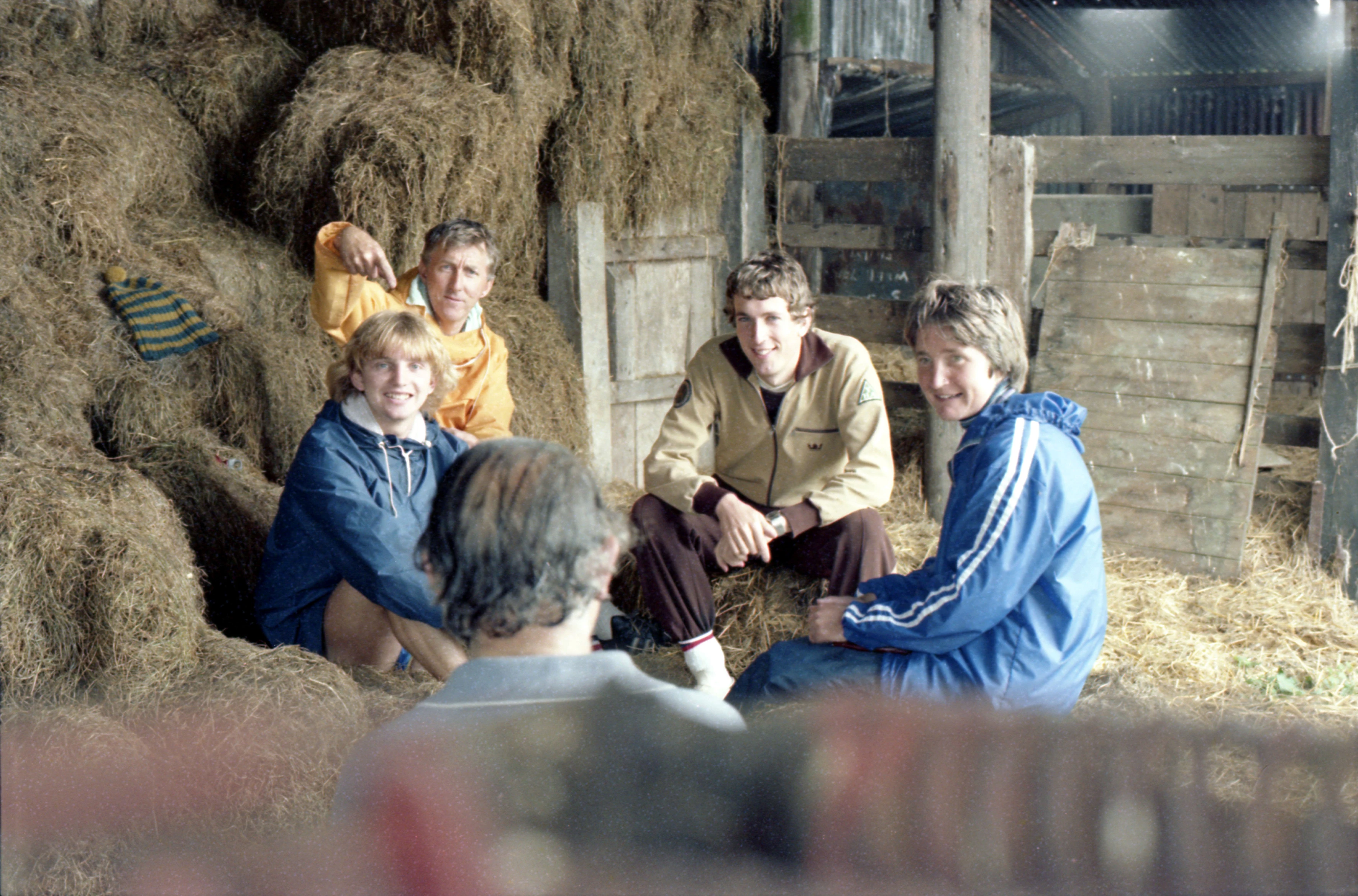 New rider Paul Nunn, Don, Colin, Michael and Val, sheltering in a barn near Moretonhampstead for lunch