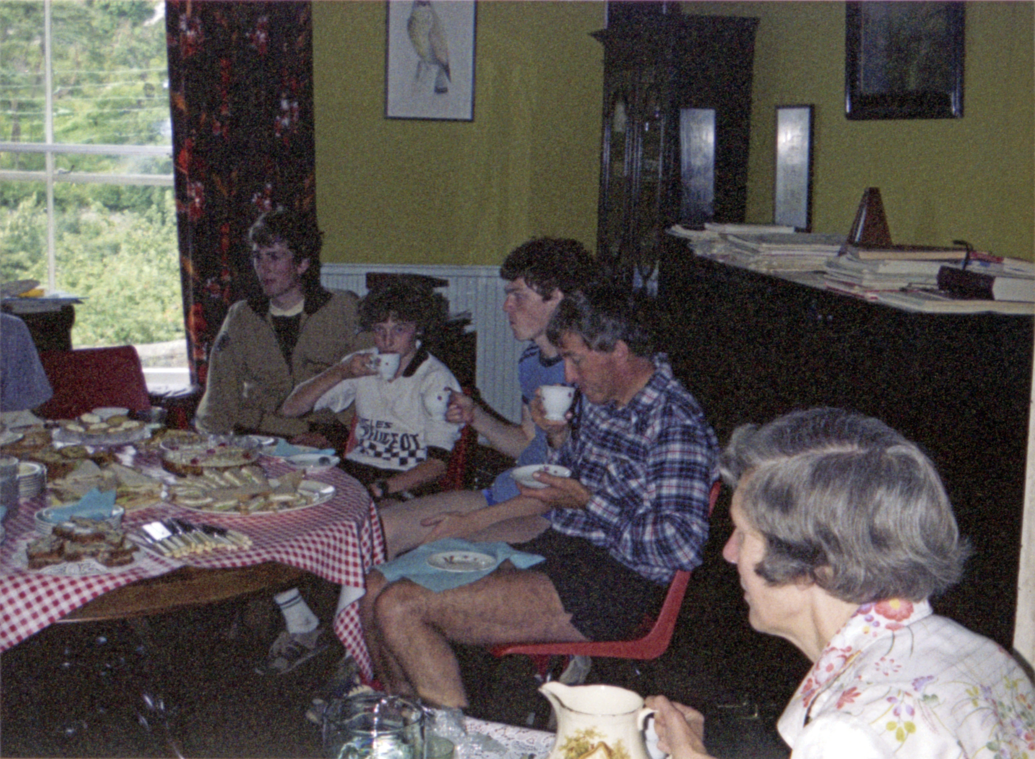 Tea being served by Christine Jones at Redmount, with Michael, Carl, John Pope and Don