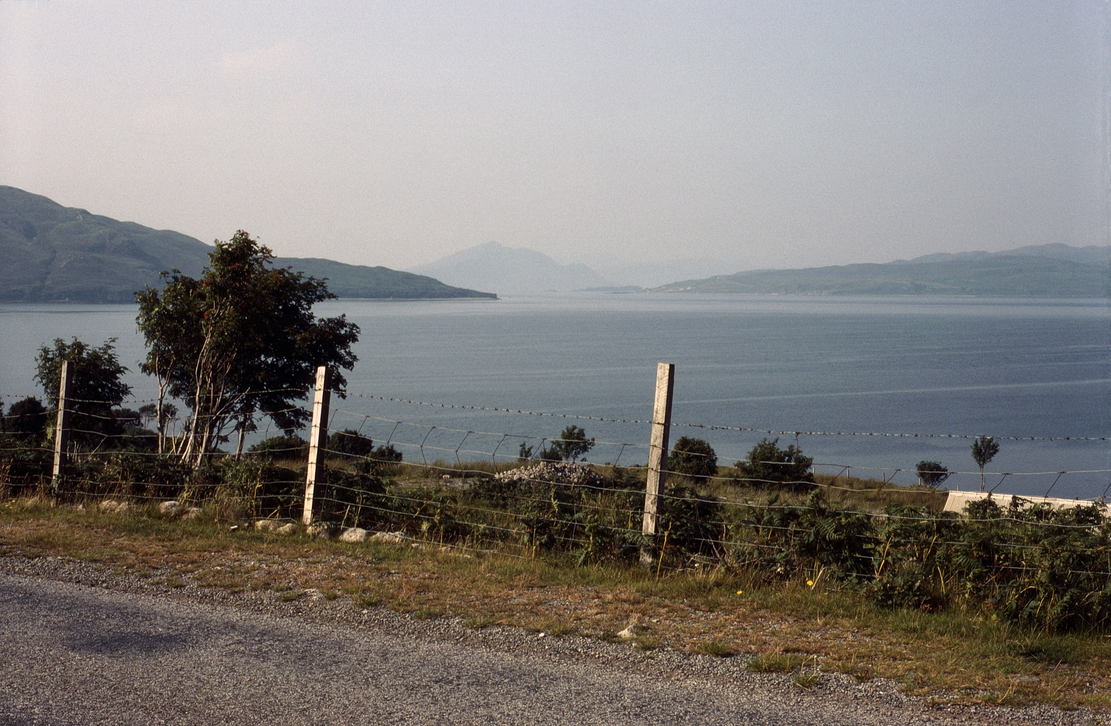 First view of Raasay in the distance from near Luib on Skye, with Scalpay on the right and the coast road to Sconser on the left
