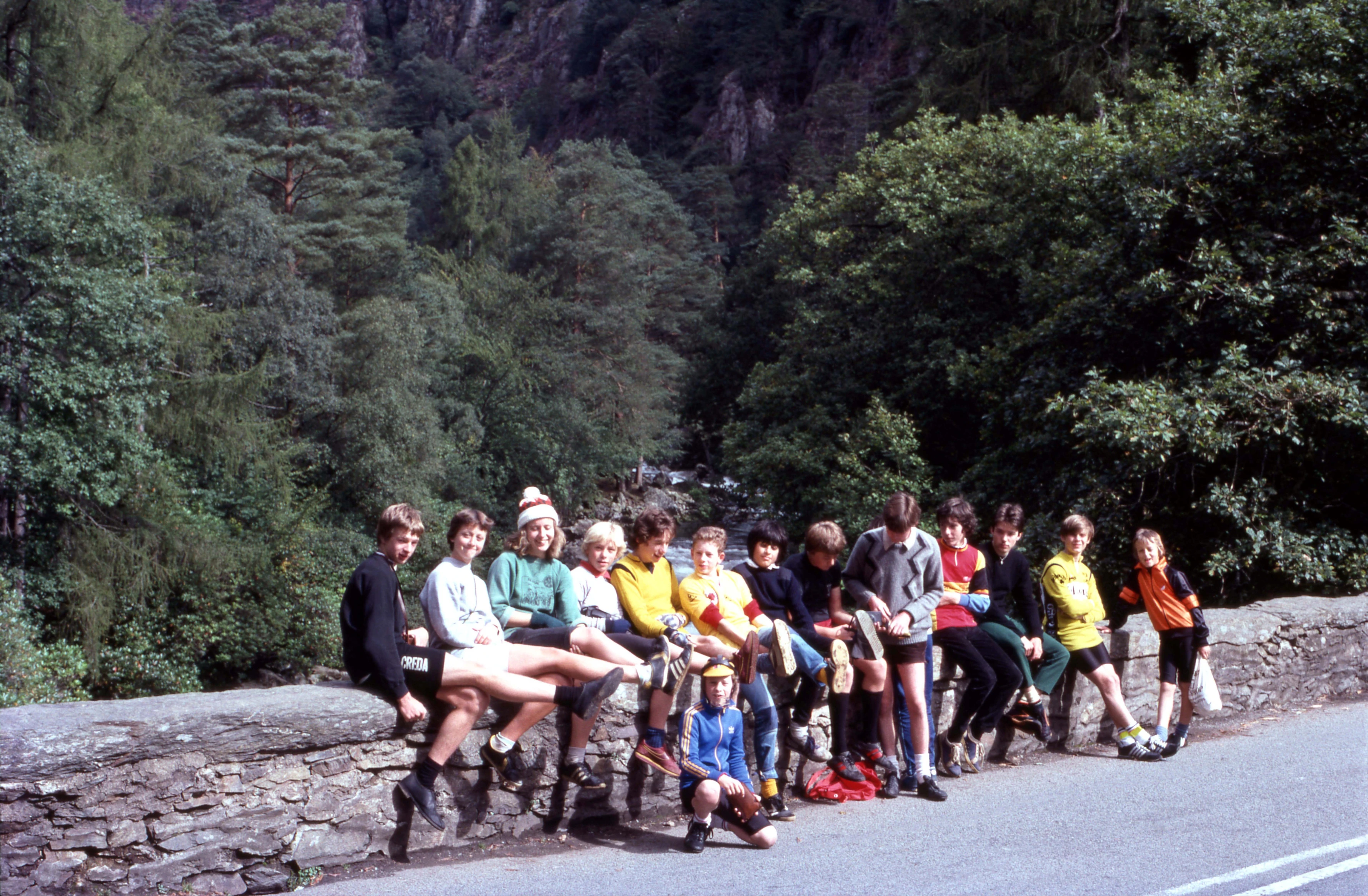 Group photo at Pont Aberglaslyn - the bridge over the Glaslyn river near the downstream end of the Pass of Aberglaslyn: Kevin, Frances, Jackie, Matthew, Mark, Glenn, Andrew W, Richard, Simon, John, (Justin), Stephen, Andrew B, Duncan and Jason
