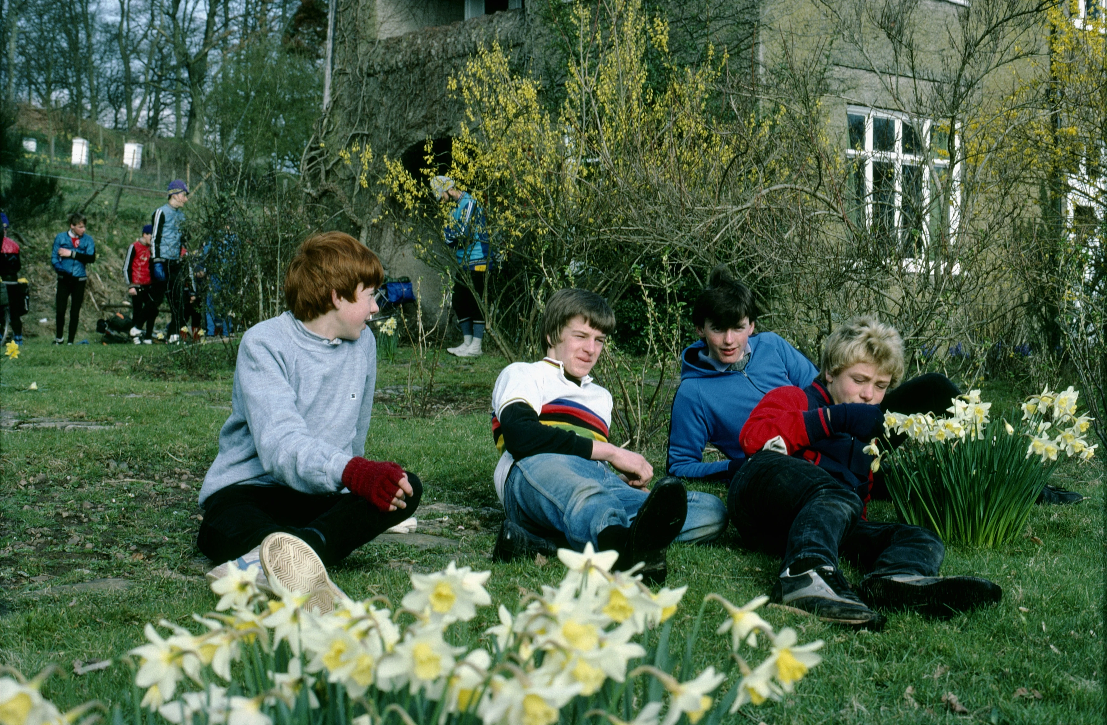Relaxing on the lawn outside Holford youth hostel
