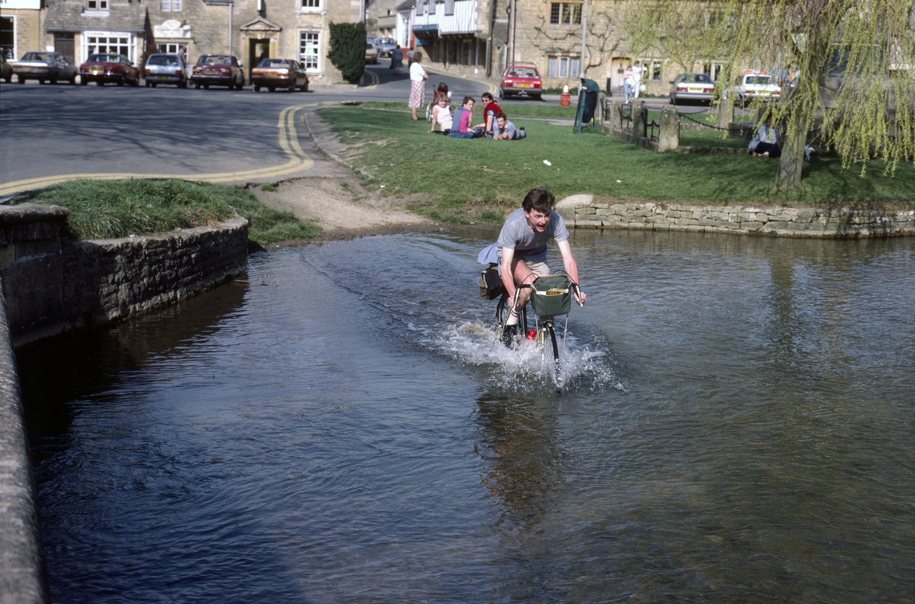 John Stuart tackles the ford at Sherbourne Street, Bourton-on-the-Water, with style